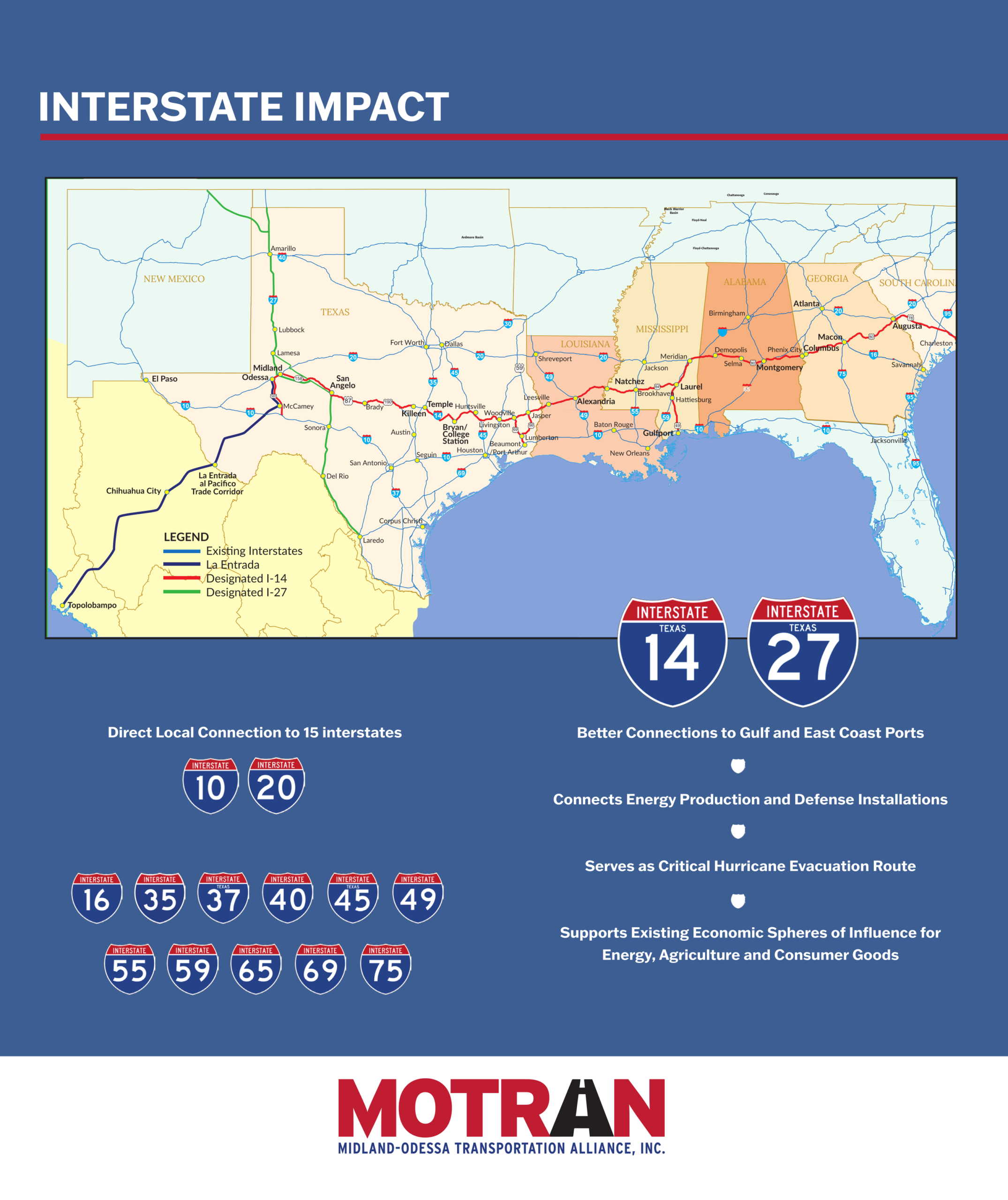 Midland-Odessa has emerged as a logistics hub for the entire nation. With the recent destinations of I-14 and I-27 through Midland-Odessa, as well as the ancillary designation of US 385 as an interstate between I-20 and I-10, Midland-Odessa will serve as a pivot point between five interstate highways.